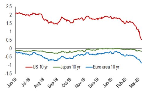 在阿德里安看来,当金融状况出现急剧收紧以及对低通胀的预期盛行时,货币政策将会发挥作用。全球央行可以迅速采取行动,通过注入流动性和降低利率来缓解金融状况的紧缩,从而防止信贷紧缩。实际上,市场一直在期待央行采取更积极的宽松政策,这也体现在许多国家的主权债券收益率出现了急剧下降。