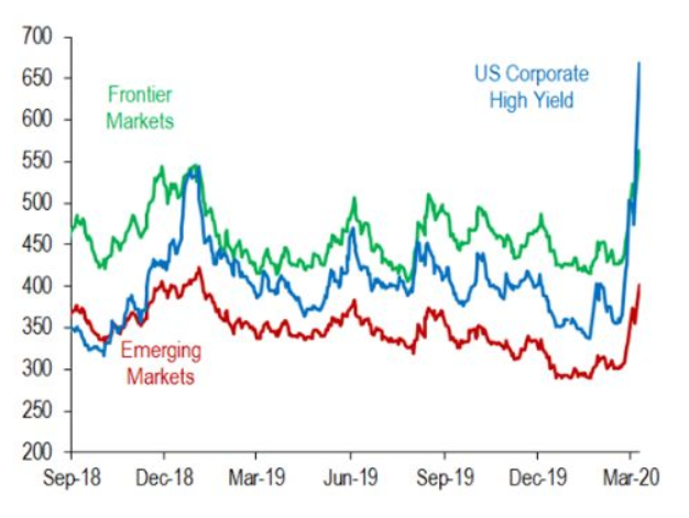 他指出,由于不确定性的急剧增加,投资者更偏向于出售风险相对较高的资产,并把资金重新分配至更安全的资产,整个金融市场的信贷息差已全面扩大。资金流的重新分配对高收益债券和新兴市场债券的打击尤为严重,这也导致了以美元计价的新兴市场债券和前沿市场债券的息差急剧扩大。