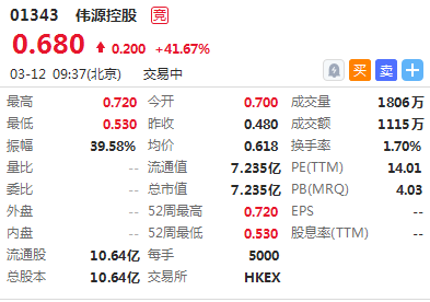 华盛资讯3月12日讯,4只新股首日挂牌,伟源控股高开近5成,截至09:39报价0.68港元,涨幅41.675,最新成交额1115万港元,总市值为7.235亿港元。