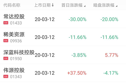 在此前的暗盘交易中,深蓝科技控股收涨5.77%,报价0.55港元,不计手续费一手可赚120港元;伟源控股收跌4.17%,一手账面亏100港元;稀美资源收跌11.66%,一手账面亏650港元;常达控股收跌20%,一手账面亏500港元。