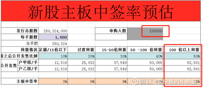 如果这只股票的申购如果预估23万人,如果超额100倍以上,回拨至50%,中签率可能是15%;