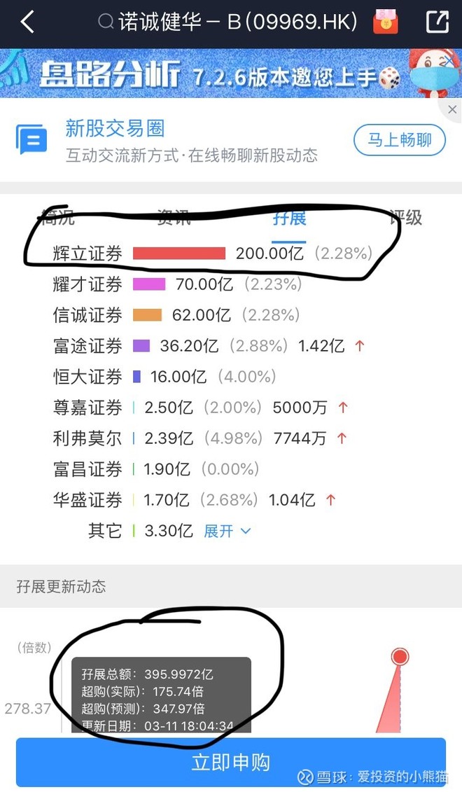 目前这只股票的超额认购倍数老大哥hui力一上来直接200个亿,第1天就给干到175倍了,然后目前各个券商,大部分都是缺额度。
