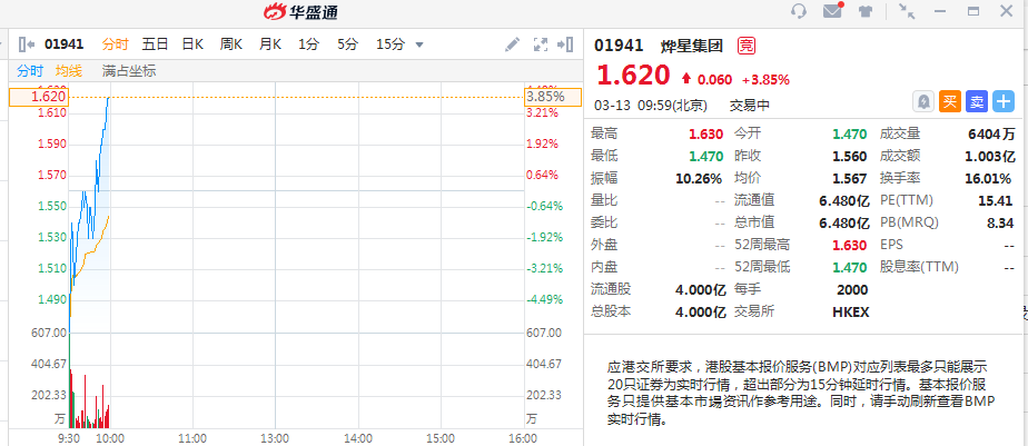 华盛资讯3月13日讯,烨星集团首日挂牌破发后翻红,截至10:00涨3.85%,成交额1.003亿,最新市值6.48亿港元。在此前的暗盘中,烨星集团收涨1.92%,报价1.59港元,不计手续费一手可赚60港元