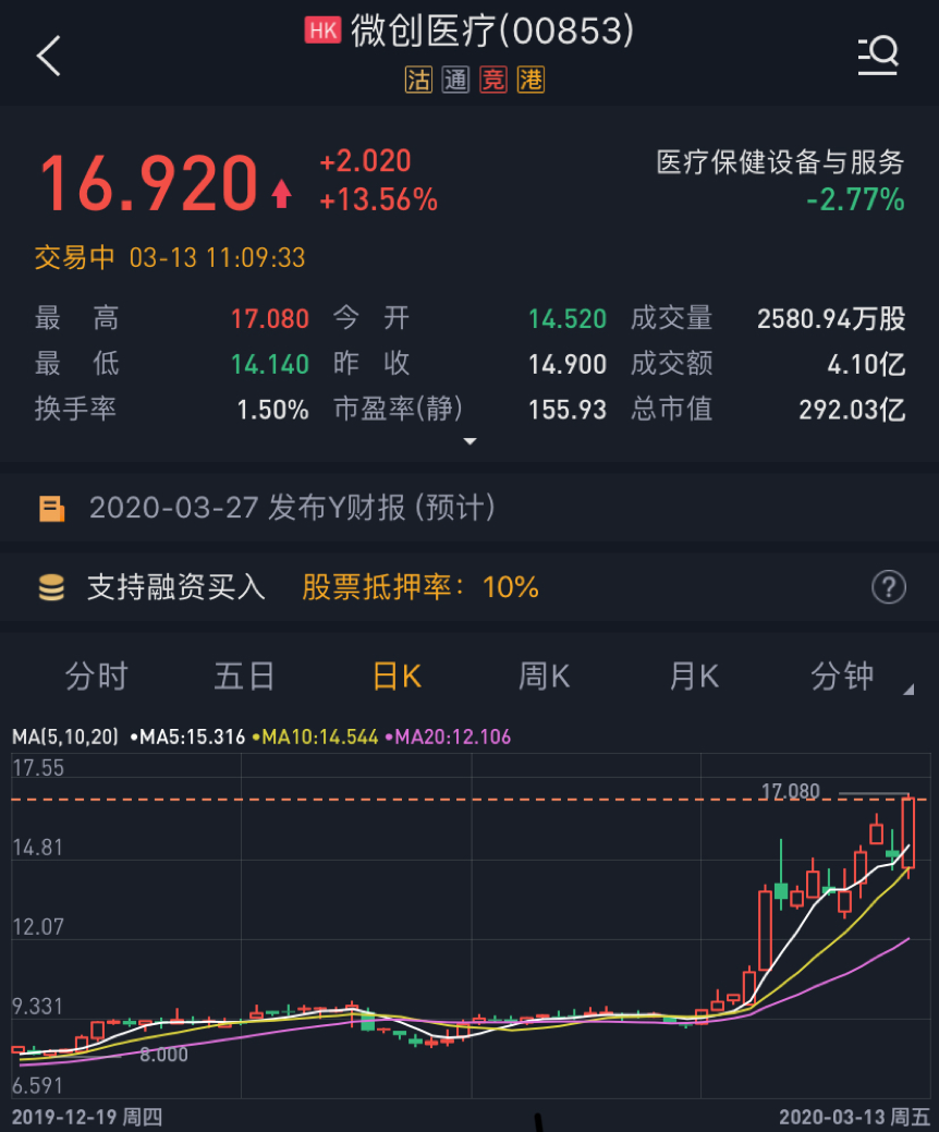 3月12日,根据港交所披露信息显示,高瓴资本已经买入微创医疗,买入平均股价约13.51港元,此次交易共买入4998.6万股,占已发行股份数量的2.89%。此外,值得注意的是,该股今年涨幅已超60%。