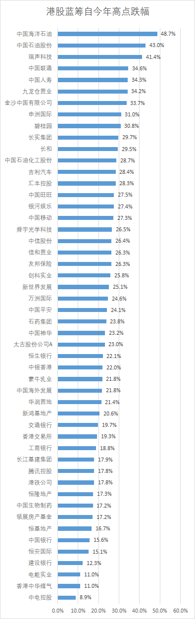 今年以来,港股蓝筹股多数股票步入技术性熊市。截至13日午盘,港股蓝筹有34只股票跌幅超20%,中海油、中石油、瑞声科技跌幅超40%,中国联通、中国人寿、九仓置业、金沙中国、申洲国际、碧桂园等跌超30%,长实、长和、中石化、吉利、汇控、中国移动、友邦保险、中国平安等重磅蓝筹也步入熊市。腾讯、工行、港交所也即将步入熊市。