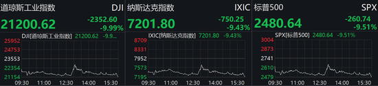 截至收盘,道指跌2352.60点,或9.99%,报21200.62点;纳指跌750.25点,或9.43%,报7201.80点;标普500指数跌260.74点,或9.51%,报2480.64点。