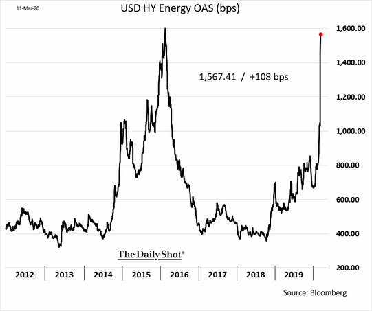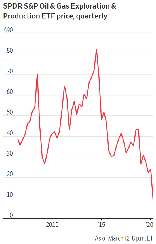 本周一的油价暴跌抹去了美国能源公司数百亿美元的市值,令债券持有者和银行对行业应对巨额资本开支的能力产生了质疑。投资者将资金快速抽出能源板块,这些企业的股债均以10%以上的幅度在缩水。