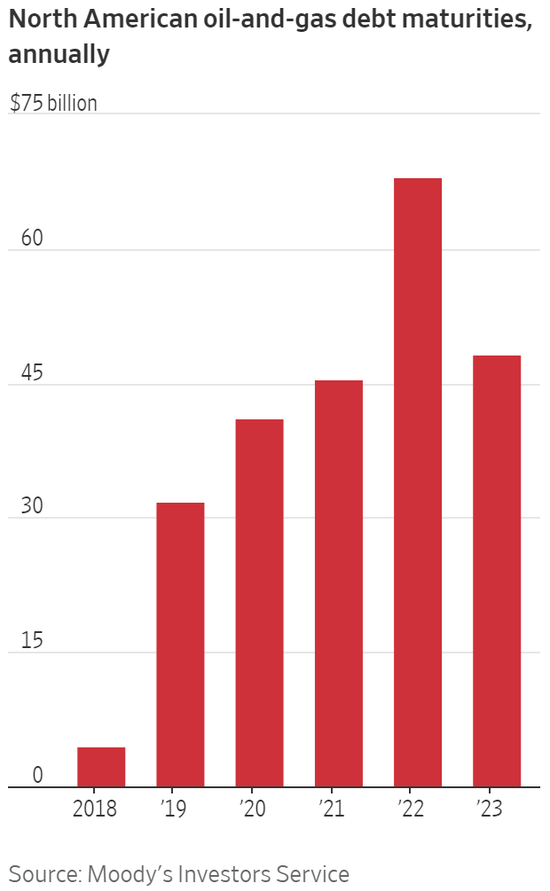 这些企业近年来借入了数千亿美元用以钻探数千英里长的油井,铺设输油管道和维护昂贵的重型机械。穆迪数据显示,目前有超过2000亿的北美石油天然气企业债将在四年内到期。