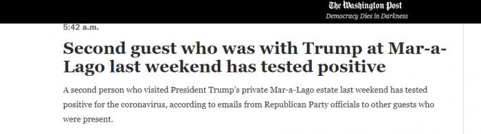 据《华盛顿邮报》等多家美媒最新报道,出席上周末美国总统特朗普海湖庄园晚宴的人员中,有第二名受邀访客新冠病毒检测结果呈阳性。