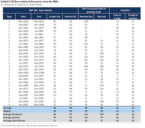 就历史经验而言,高盛将熊市分为3类——结构性熊市、周期性熊市和事件驱动熊市。在当前阶段,市场看起来更像是事件驱动熊市。“就历史平均表现来看,这一模式下,市场跌幅在29%左右,并且会在半年内见底,一年内恢复。需要密切关注高盛全球风险偏好指标(GSRAII)和全球熊市指标(GSBLBR)。前者已经达到了一个复苏水平,后者则开始闪现风险下降的信号,此前该指标持续高企。”