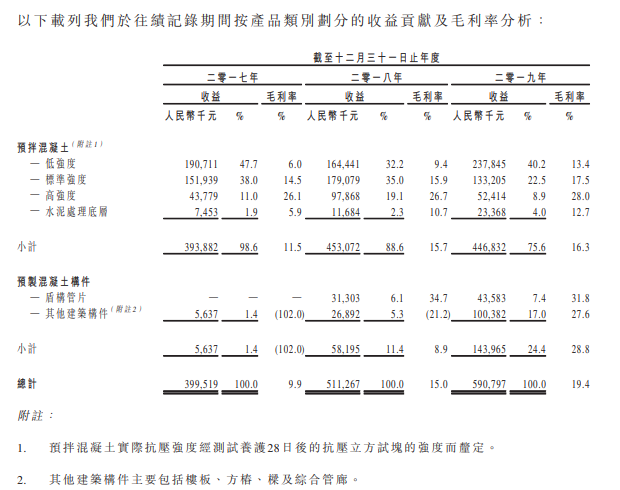 该集团经营范围为预拌混凝土生产、加工、销售、生产水泥混凝土预制构件等业务,不仅具有五条全封闭除尘式预拌混凝土自动化生产线,其中180型四条,240型一条,而且还拥有两间生产厂房,即预拌混凝土厂房及预製混凝土构件厂房,并于厦门租赁一个生产车间( 即集美车间 ),截至2019年12月31日止年度预拌混凝土及预製混凝土构件的总产能分别约为1,439,000立方米及约128,300立方米。