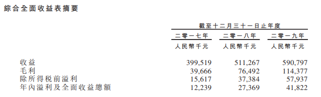 2017-2019年,公司总收益分别约为人民币4.0亿元(单位下同)、5.11亿及5.91亿元;年内溢利及全面收益总额分别为1223.9万、2736.9万以及4182.2万。