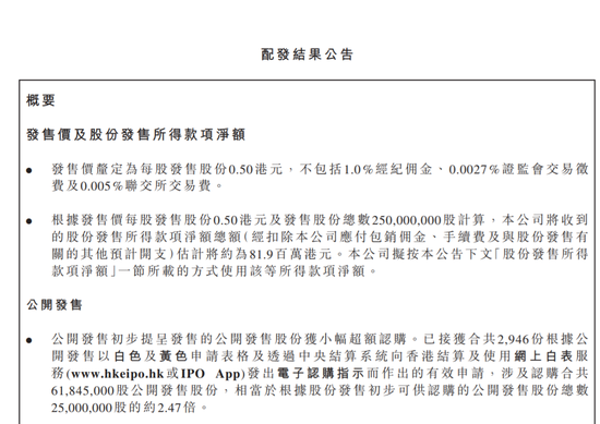 公开发售初步提呈发售的公开发售股份获小幅超额认购。已接获合共2946份有效申请,涉及认购合共6184.5万股公开发售股份,相当于根据股份发售初步可供认购的公开发售股份总数2500万股的约2.47倍。