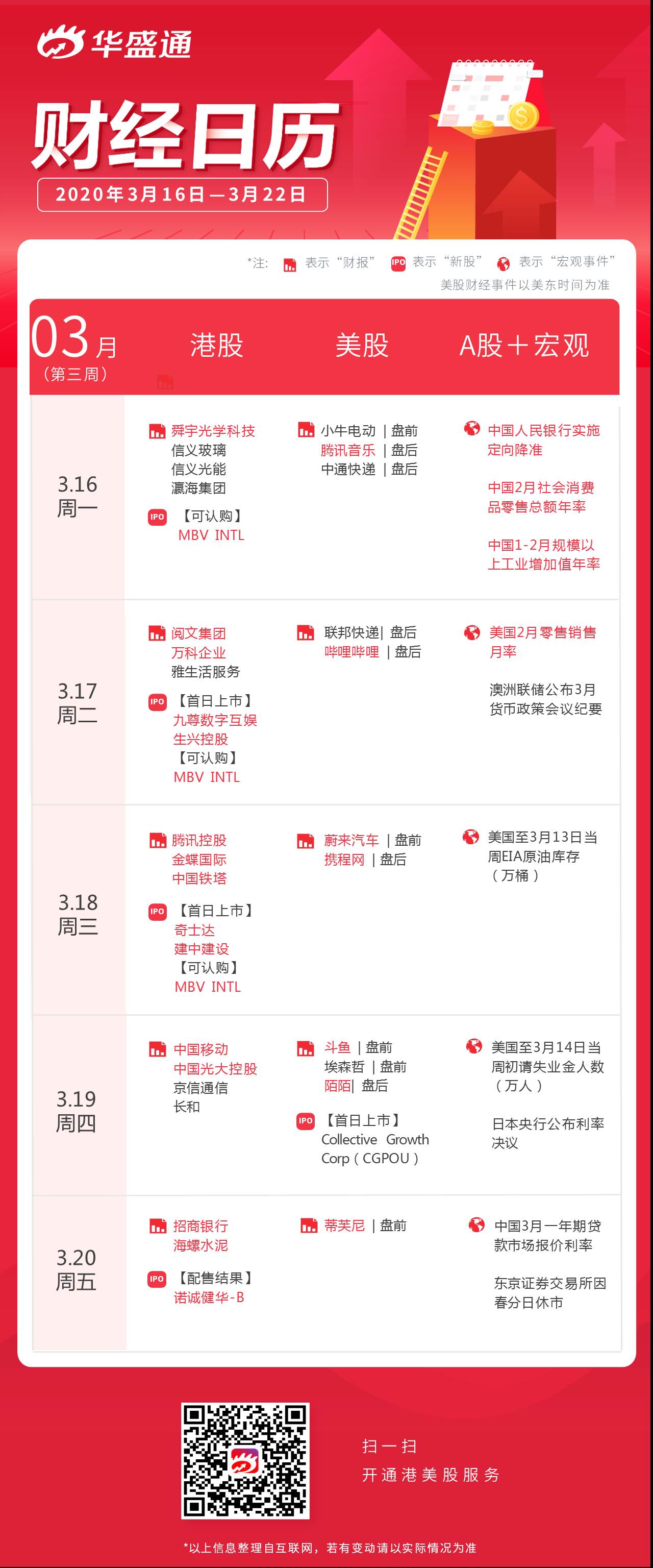 以上即为本周港美股、A股及宏观资讯一览,祝新的一周投资顺利~点击“日历”专区,了解本周更多财经大事↓