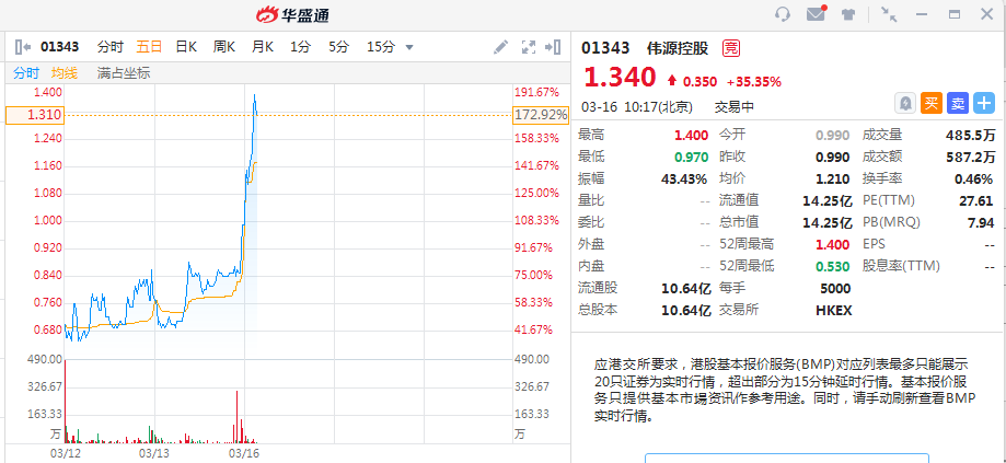 华盛资讯3月16日讯,次新股新加坡的承建商伟源控股盘初大涨35.35%,报价1.34港元。上周挂牌首日曾大涨65%。