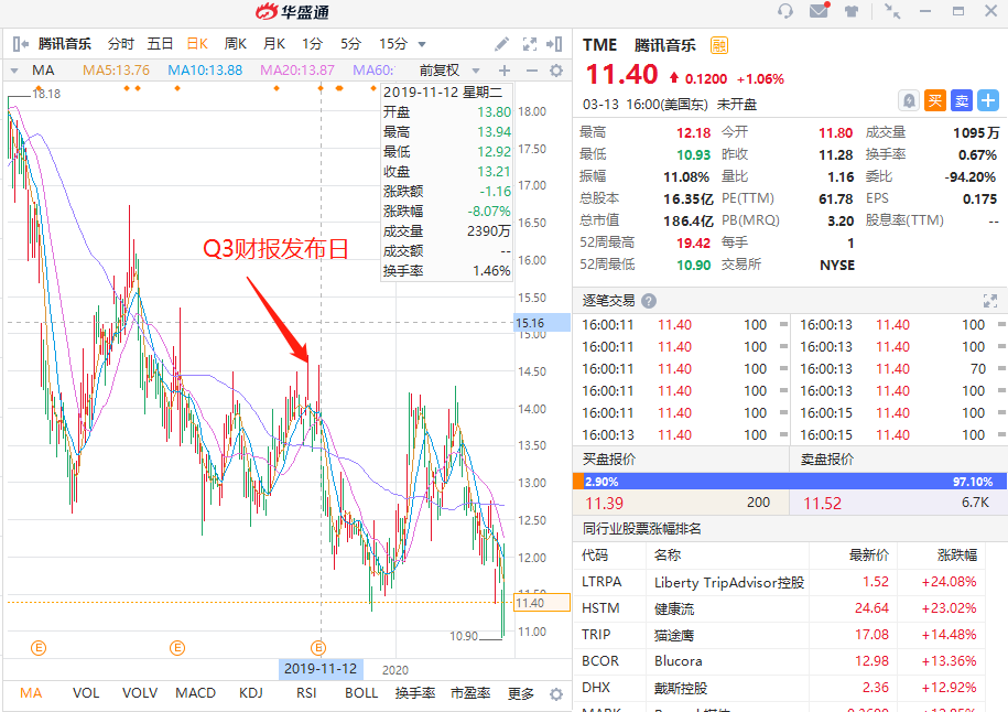 财报发布后,股价表现比较弱势,整体上看从11月11日收盘价14.37美元至今11.40美元,腾讯音乐的股价在区间内下跌20.67%。2019年全年,腾讯音乐的股价跌幅达11.2%。