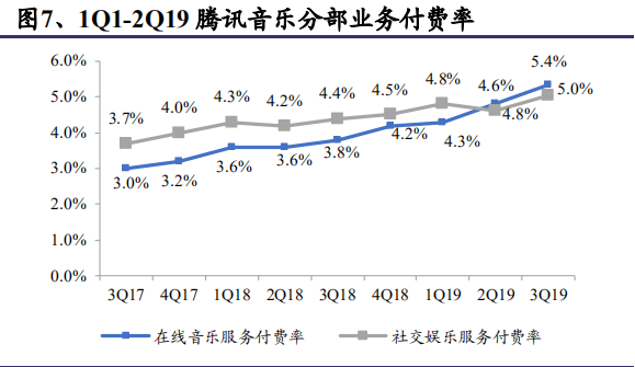 频出爆款的背后,是付费用户的急速增长。2019Q3,付费用户达 3540 万,同 比增长高达 42.2%,付费率提升至 5.4%,环比上升 0.6 pcts;在线音乐月度 ARPPU为 8.9 元(YoY +4.7%),目前,腾讯音乐总付费用户数仅次于 Spotify、Apple Music,位居全球第三。