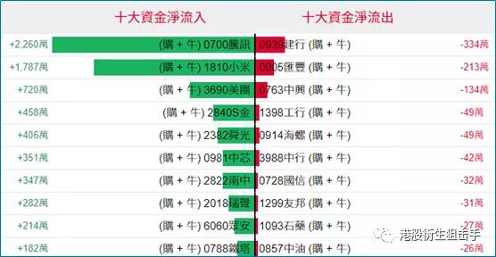好仓(认购证及牛证)方面,有2260万、1787万港元资金分别净流入腾讯、小米部署造多,而有少量资金净流出建行及中兴套现。