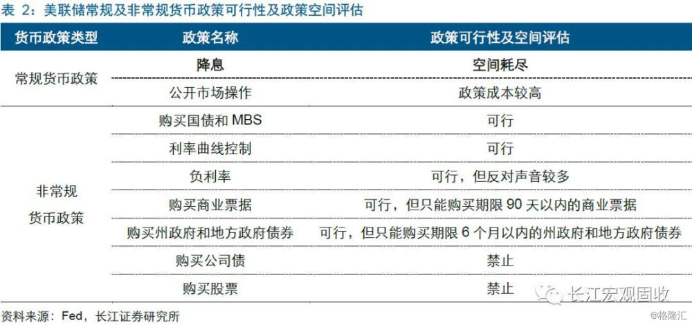 美联储将基准利率降至0%-0.25%之后,常规降息空间已经耗尽。若美国经济未来持续加速恶化,美联储一方面可能加大QE的购债规模(具有较大空间)及范围(增加商业票据及地方债购买等);同时,也可能效仿日央行等,实施利率曲线控制政策,直接锚定长端利率。由于《联邦储备法》明令禁止,美联储无法像日央行那样购买股票,也无法效仿欧央行购买公司债。