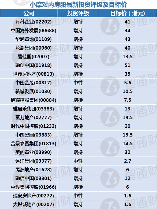 小摩发布报告称,更新对内房股最新投资评级及目标价,如下表: