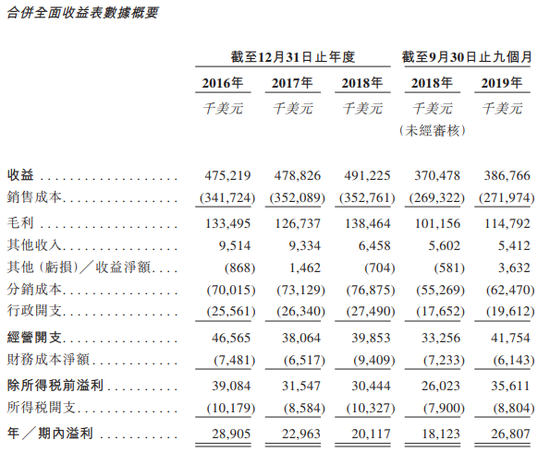于2016年、2017年及2018年以及截至2018年及2019年9月30日止九个月,公司整体的纯利分别为2890万美元、2290万美元、2010万美元、1810万美元及2680万美元;同期公司的整体纯利率分别为6.1%、4.8%、4.1%、4.9%及6.9%。