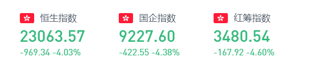 截止收盘,恒生指数跌4.03%,报23063.57点;国企指数跌4.38%;红筹指数跌4.6%。