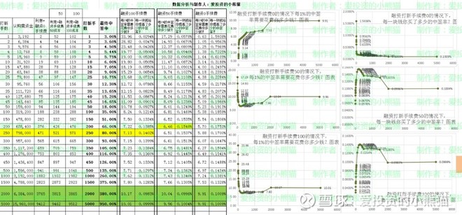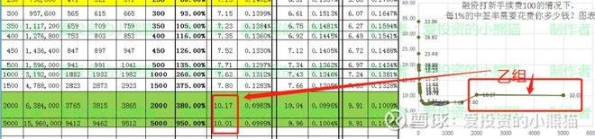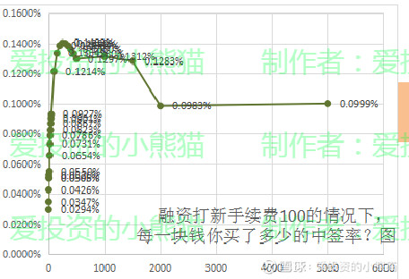 所以如果你想中签的话,只能融资认购,不管是去甲组还是去乙组,都是属于融资认购的范畴。那如果要考虑一下这个认购的成本呢,特别是融资认购的,券商通常融资认购收取100的融资打新手续费用,绝大多数券商如此,也有收80的,稍微便宜一点的也有五六十块。这里我们就以100元和50元以及0元这三个标准来计算吧。下面小熊猫也给大家把数据整理出来,做成了图表的形式