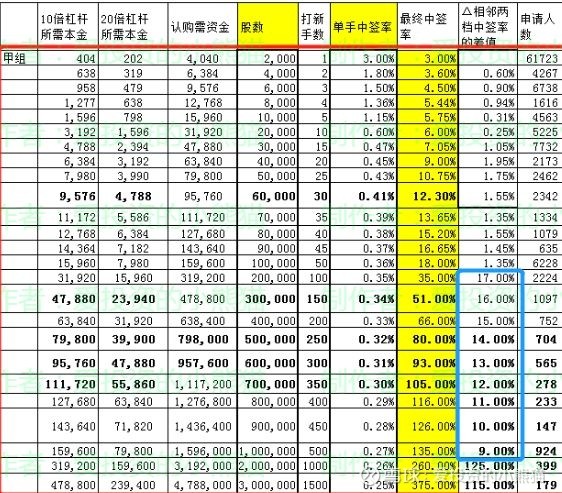 反观甲组的情况,虽然中签率也很低,一手中签率只有3%,那如果你认购白手以上的话,那这个股票就很可观了,甲组只要你的认购超过150手以上的成本就在7块钱左右,150首中签率高达51%,当然这个股票最佳认购是在250手左右,这个档位中签率高达80%,并且成本在7块1毛3是最低的,每个账户打新到这个档位性价比最高。