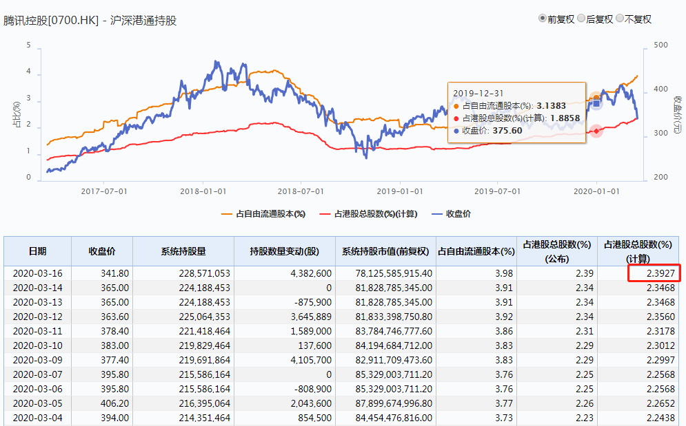 近期国际股市虽然剧烈震荡,腾讯的股价随之调整下挫。但从沪港通资金数据上来看,腾讯已成为许多南下资金避险的选择。实际上,从2019年12月31日的沪深港通持股比例来看,当时这个数字是1.89%。