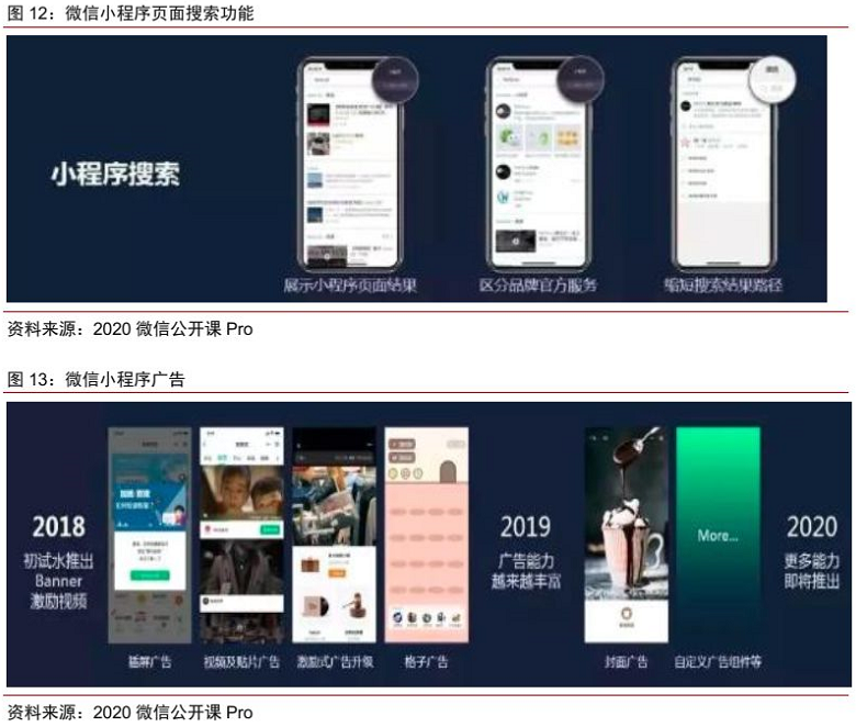 在2020年度微信公开课会议上,微信团队亦表示将持续强化小程序页面搜索、小程序发现、消息推送、直播组件等能力,并提出构建基于交易场景的商业闭环,有望对小程序用户活跃度、商业变现能力带来显著改善。