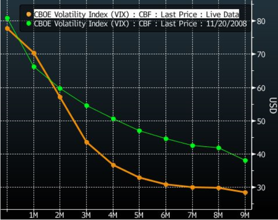 近月VIX期货合约目前报70左右。而再远一个月的合约就跌到了60以下。再往曲线后看四到七个月,合约的交易价格仅为2008年峰值水平的70%,Susquehanna衍生品策略联席主管Chris Murphy在报告中写道。