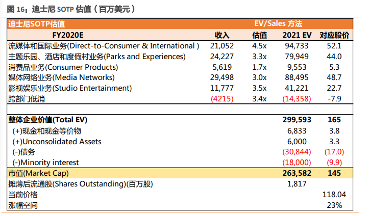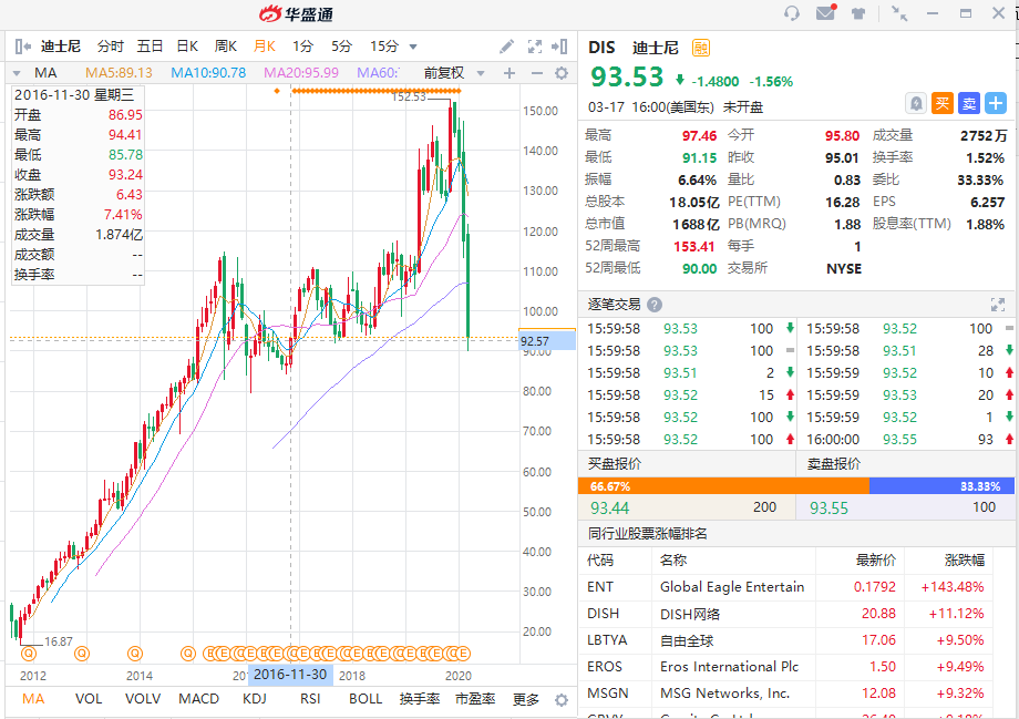 在天风证券的近期估值分析中,给出迪士尼企业的合理价值对应股价165元,而当时迪士尼的股价是145元。近期美股形势急转直下,迪士尼的股价已经到了95元。