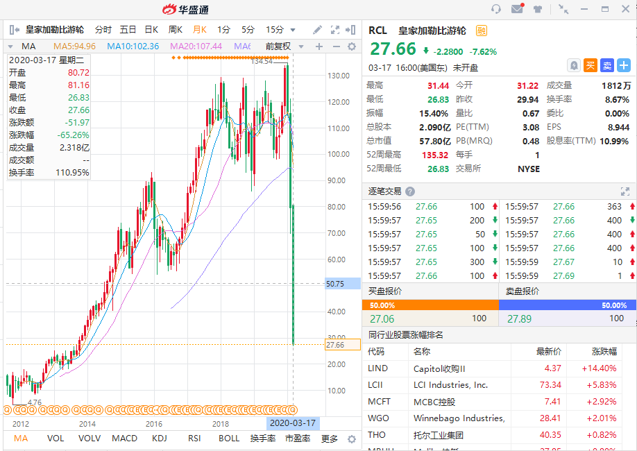 除了游乐园,旅游相关的邮轮旅游业遭受重创,美股包括三大邮轮巨头——嘉年华、皇家加勒比 、挪威邮轮。皇家加勒比邮轮从最高点134元,跌到近期27.6元,跌幅简直让人直呼不可思议。皇家加勒比邮轮集团是世界第二大邮轮公司,旗下拥有皇家加勒比邮轮、精致邮轮、伯曼邮轮、阿塔马拉邮轮、法国 CDF 邮轮五个品牌。邮轮旅游业是一种以大型豪华游船为载体,以海上巡游为主要形式,以船上活动和岸上休闲旅游为主要内容的高端旅游活动。