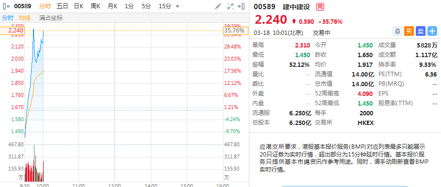 华盛资讯3月18日讯,建筑服务提供商建中建设首日低开12.12%后迅速翻红,一度飙涨至40%。截至10:02涨35%,报价2.24港元,最新成交额1.11亿,总市值14亿港元。