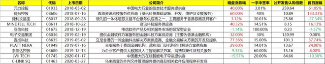 3、行业&公司:软件服务,这个公司的业务有点意思,主要营收来自于给客户处理数据,将客户(主要是银行、保险及零售商)的原始文件及资料按照要求进行数字化转换之后打印出来邮寄或者电邮给客户的客户,主要产品就是咱们通常所说的文档处理软件,像金山办公这样的。以下是软件开发类新股的上市表现数据,6涨3跌1平。