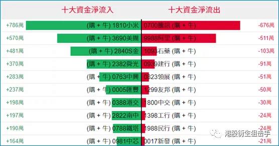 好仓(认购证及牛证)方面,有786万、570万港元资金分别净流入小米、美团部署造多,而有少量资金净流出腾讯、阿里套现。