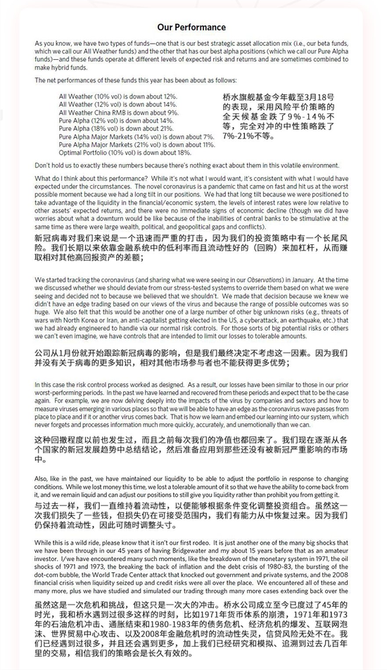 对于这个业绩,桥水表示,这次损失在可承受范围里。桥水解释道,新型冠状病毒是一种迅速蔓延并在最糟糕的时刻袭击我们的流行病,因为我们仓位向长期倾斜,以便我们能够利用金融/经济体系的流动性,利率水平相比其它资产的预期回报率偏低,以及没有经济下滑的即刻迹象。