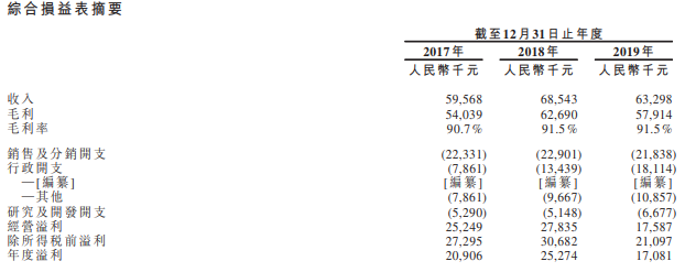 截至2019年12月31日止三个年度,该企业的毛利分别约为人民币5404万元、人民币6269万元及人民币5791万元。于期内,该企业的毛利率为91.5%,维持稳定。