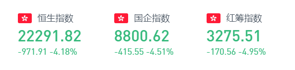 18日开盘,恒生指数低开1.03%,随后迅速拉升至翻红。午后跳水,由涨转跌,且跌幅不断扩大。截至收盘,恒生指数跌4.18%,报22291.82点;国企指数跌4.51%;红筹指数跌4.95%。