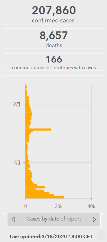 世卫组织实时统计数据显示,截至欧洲中部时间18日18时(北京时间19日1时),全球新冠肺炎确诊病例累计达到207860例,死亡病例8657例,已报告病例的国家和地区达166个。