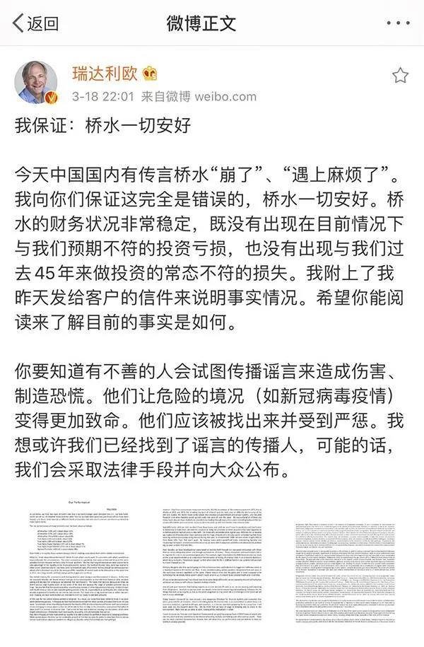 当天深夜10点,桥水基金创始人瑞·达利欧(Ray Dalio)在其微博上回应称:“我保证:桥水一切安好”。