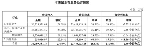 在营收中,万科来自房地产及相关业务的营业收入为3,526.5亿元,同比增长23.90%,占总营收的比例为95.9%;来自物业服务的营业收入为127.0亿元,同比增长29.65%,占比3.5%。