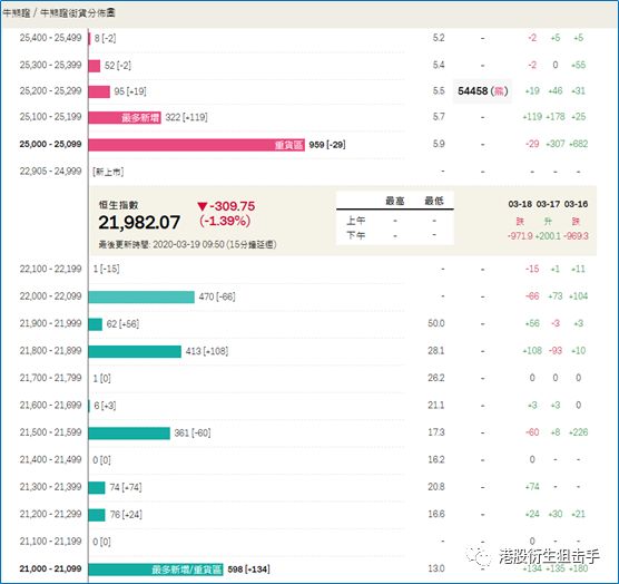 街货分布方面,截至周三,恒指牛证密集分布在收回价21000点至22100点区间,相当约2056张期指合约,而熊证则集中分布在收回价25000点至25400点区间,相当约1428张期指合约。