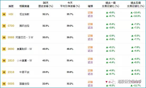 周三恒指波幅指数(VHSI)收报59.86,上涨7.43%。个股权证方面,个股的相关认购证引伸波幅多数上调,而友邦、中国移动则分别大跌38.40%、45.10%。认沽证方面,美团点评上调8.7%。