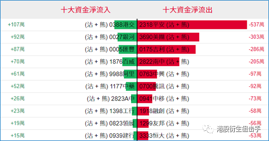 淡仓(认沽证及熊证)方面,有少量资金净流入港交所、银河部署空单,而有537万及3690万港元资金净流出平安、美团套现。