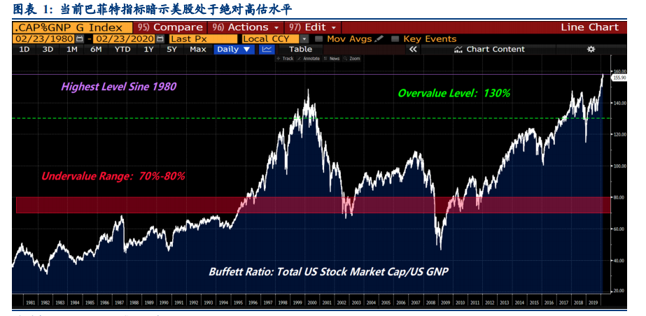 截止 2019 年四季度伯克希尔·哈撒韦公司持有 1279 亿美元,从巴菲特惯用的指标: 美股总市值/美国 GNP 比值来衡量,该指标创出 40 年来最高水平,这意味着现在美股整体估值的昂贵程度已经超过了 2000 年互联网泡沫时期,远远高于巴菲特认为可以入市的水平。