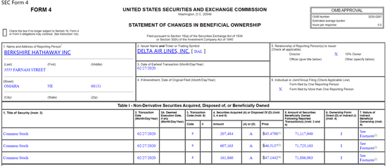 2月27日,巴菲特旗下的伯克希尔·哈撒韦购入了曾经被其嗤之以鼻的航空股,以每股45.48美元至47.14美元的价格,买入97.6507万股达美航空股票,斥资约4530万美元,最新持股达7188.6963万股。