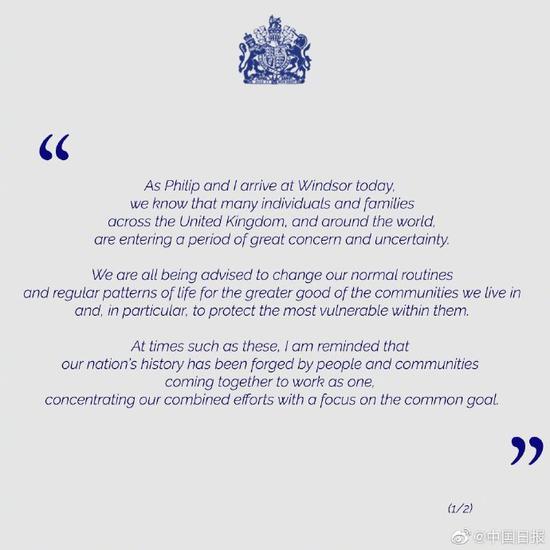【#英国女王发表声明呼吁团结#】英国女王伊丽莎白二世于周四傍晚发表声明,称自己和丈夫菲利普已于今天抵达温莎城堡。声明中她感谢了一线抗疫人员的付出,并且表示整个英国乃至全世界的民众和家庭都进入了一段充满担忧和不确定性的特殊时期,呼吁英国民众团结一致对抗疫情,“每个个体都在接下来的几天、几周和几个月扮演着极为关键的角色。我们中的许多都需要通过新的方式来保持联系,同时确保我们所爱的人安全……我和我的家庭已为此做好准备。”(记者 韩宝仪)