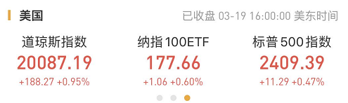 北京时间3月20日凌晨,道指收盘上涨188.27点,或0.95%,报20087.19点;纳指涨160.73点,或2.30%,报7150.58点;标普500指数涨11.29点,或0.47%,报2409.39点。