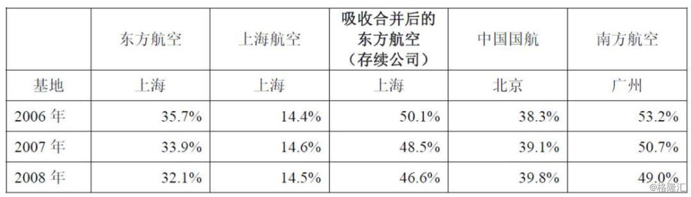 东方航空和上海航空都是以上海为基地的航空公司。东上合并后,作为存续公司的东方航空在上海基地的客运市场份额为46.6%,接近于南航在其广州主基地的市场份额,高于国航在其北京主基地的市场份额。